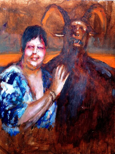 En la obra Jafet nos presenta a una mujer rolliza que posa su brazo con evidente cariño sobre su propio deseo, su propio desenfreno, esta mujer adora su parte maldita, no la rechaza ni la señala sino que se muestra cariñosa y con gesto desafiante nos invita a probar, a vivir, a tomar la cátedra que Mefistófeles le dio a Fausto. En la pieza resalta la gama de rojo, veladuras que nos remiten a una ejecución barroca y empastes en proporción adecuada que reviven esa pintura carnal, de músculo sintiente a lo Rembrandt, en otras partes la pintura escasea, se nota la huella del pincel, el efecto es fantasmagórico y recuerda los burdeles atestados de humo y humanos hedores. Este tratamiento escrupuloso y dedicado en la textura hacen de la pieza ejemplo de carnalidad demoniaca, no por la maldad que pueda inspirar a unos o asustar a otros, sino porque carne es pensamiento, pensamiento es experiencia y así: pecar es probar, es conocer, es dar sentido a lo vivido. Vamos entonces a entregarnos al pecado y que Chuy se quede a darle alpiste a los pichones.