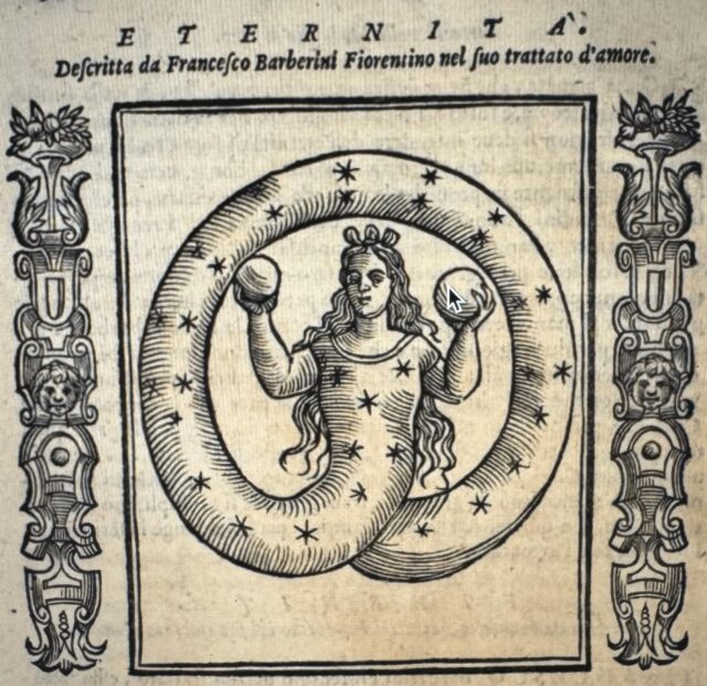 En esta obra, de Cesare De Ripa, se comprende un método de definición icónica de conceptos morales abstractos, ofreciendo así a los artistas plásticos un compendio o repertorio de imágenes, conceptos y formas de representación como un tipo de diccionario del que podían hacer uso para sus propias obras (García Mahíques, 2008). En la explicación en prosa, se describe la fórmula para dar el significado de eternidad en una imagen: “(…) para pintar la eternidad, el más generalmente adoptado por los artistas, y el que habla más claramente a los sentidos, es el de la serpiente formando círculo y mordiéndose la cola” [sic] (Pastor, 1866, p. 135). El conjunto de significados y descripciones son agrupados semánticamente, por lo que a la par de “eternidad”, se mencionan los conceptos de “tiempo” e «inmortalidad”. Este ejemplo, es de los primeros estudios iconográficos-iconológicos.