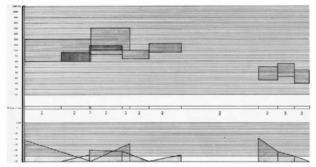Esta partitura consta de dos ejes de coordenadas que deben ser leídos en simultaneidad. El eje vertical superior muestra la distribución de las masas sonoras sobre el rango de frecuencias (medido en hz) y en el eje vertical inferior se indica la variación de volumen de cada uno de los objetos (medido en db). Este aparato gráfico trae consigo tanto un sistema de categorías como uno de formas y figuraciones que, tienen como fundamento constructivo un imaginario. En consecuencia, la música ha podido desarrollar un pensamiento que se desenvuelve en el ámbito de las formas espacio-temporales.