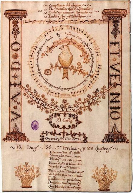 En el emblema “El Carlos”, la música está inscrita en un pentagrama lineal y en uno circular, en ambos casos, su lectura es una forma musical en específico: el canon. Esta forma parte de la interpretación simultánea de una misma melodía varias veces a distancia temporal de una o varias notas. Es decir, que la música es interpretada cíclicamente. El poder monárquico, tanto en las picturae como en la configuración visual dedicada al rey Carlos II, se ve expresado en las columnas de Hércules y el plus ultra, donde la idea de la circularidad está “labrada” en éstas por el lema Vado et venido: Voy y vuelvo. Por lo que, entre los códigos verbal, visual y musical hay una relación de redundancia comunicativa: una reiteración de las ideas a través de la alegoría.
