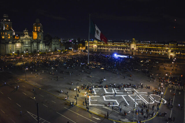 En una de esas marchas a mí me tocó al final y debía estar pendiente de la retaguardia, porque generalmente ahí es la zona también del bloque negro, donde puede haber más confrontación con la policía, más intensidad; era estar monitoreando eso o estar siguiendo eso, pero en general creo que fue una marcha bastante tranquila, no pasó nada, llegaron al Zócalo y ya en la llegada en el Zócalo me daba vueltas para ver qué otra foto podía hacer y me topé con que unos chavos estaban haciendo unas pintas, pero a nivel del piso: se sabía qué estaban poniendo, pero no tenías una perspectiva interesante o buena compositivamente, y entonces lo que hice fue subirme al Hotel México, creo que se llama, que está ahí justo en la plancha, donde regularmente a veces nos dan chance de subir como medios cuando había manifestaciones masivas.