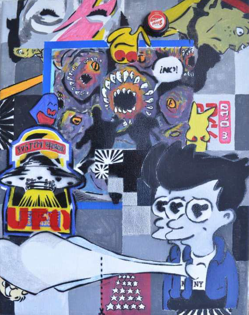 La pintura de Ibarra Luna, tanto la pieza que aquí comento como la mayoría de su producción reciente, utiliza la yuxtaposición como método esencial para componer sus imágenes, los colores sólidos, la estética del graffiti, los referentes a la sociedad de consumo; su obra representa el flujo de pensamiento de una persona en el mundo contemporáneo, todos al cerrar los ojos nos podemos encontrar en este embotellamiento visual en donde la invasión de la publicidad y el mundo del diseño comercial nos envuelven en una saturación caótica. Las imágenes nos tragan y nos mastican y no al revés como podría esperarse.
